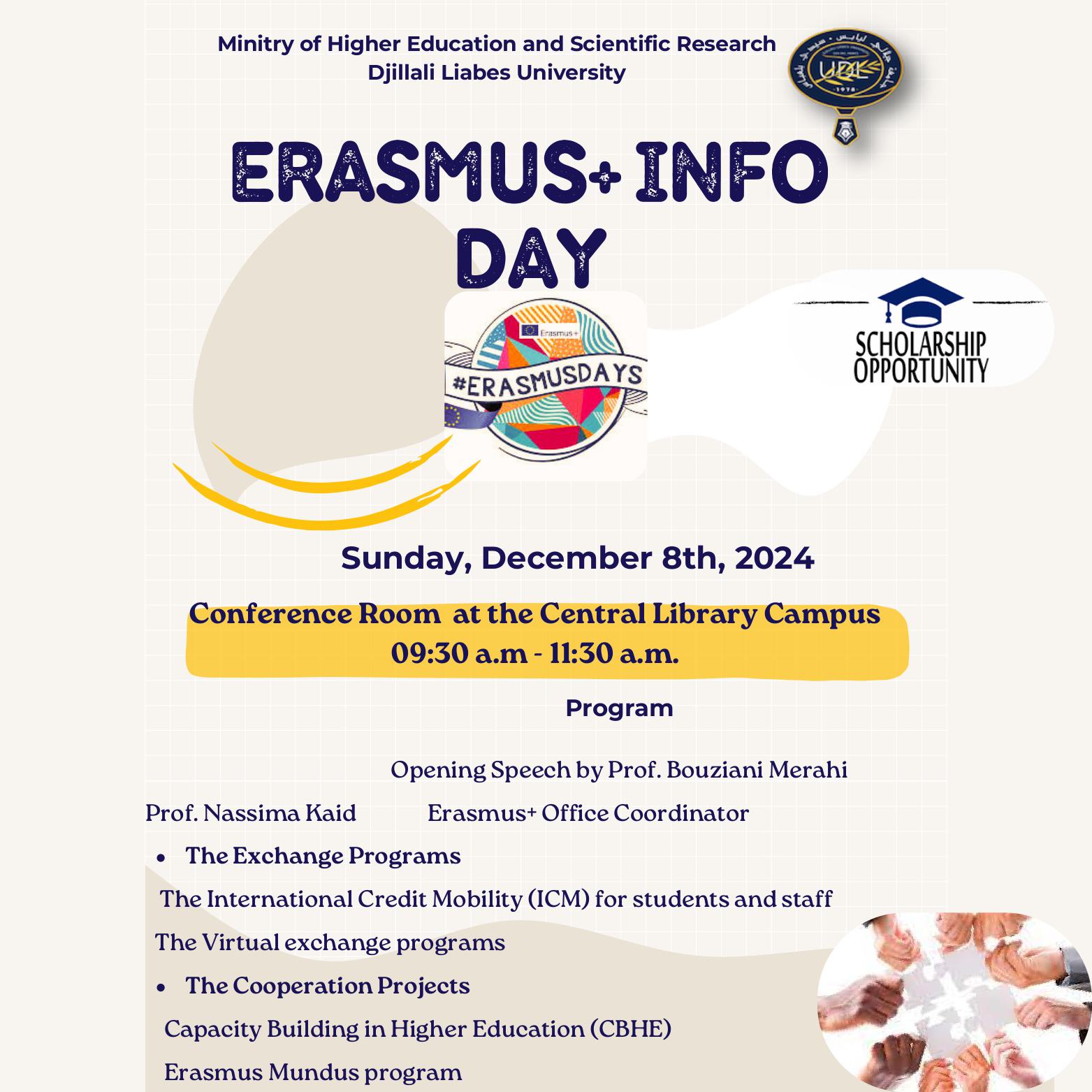 L'Université Djillali Liabes a l'honneur d'organiser une journée d'information sur Erasmus+au profit des étudiants inscrits à tous les niveaux et au enseignants.